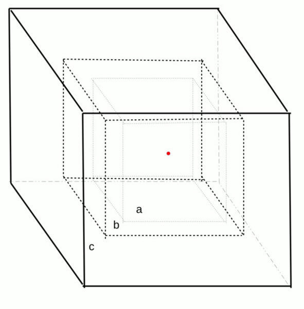 Рис. 2.1. Гиперкубы с ребрами a, b и c, вписанные друг в друга с общим центром, совпадающим с началом координат в пространстве размерности 3.