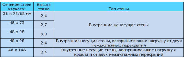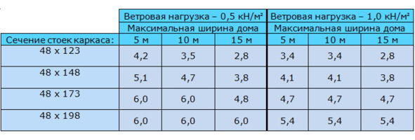 Данные, приведённые в таблице 9.3 предусматривают: шаг стоек 0,6 м; класс качества древесины C18 (3-й сорт); максимальную ширину дома 10 м (расстояние между несущими стенами).
