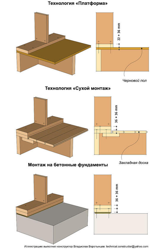 Технология «Платформа» стены монтируются поверх чёрного пола на цокольном перекрытии, который одновременно является рабочим настилом. Применяется в тех случаях, когда монтаж происходит быстро, в хорошую погоду. При этом обязательно применение влагозащищенных плит OSB-3 с соединением гребень-паз для защиты цокольного перекрытия от попадания влаги в случае осадков.