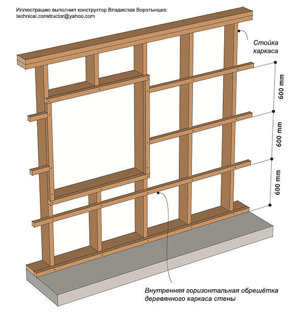 Рис. 9.17 Пример внутренней горизонтальной обрешётки скандинавской каркасной стены