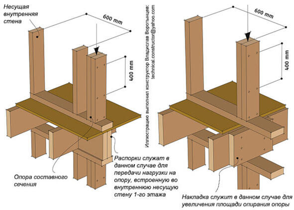 Важно помнить, что в местах сосредоточения нагрузок нагрузки должны передаваться дальше, по направлению к фундаменту. Для этого необходимо чтобы несущие деревянные конструкции не прерывались, а передавали нагрузку дальше всей площадью опорного сечения. Иными словами, опора не может просто так монтироваться на черновой пол перекрытия, нагрузка должна передаваться на несущую конструкцию ниже. Для этого в перекрытие встраиваются распорки под всю площадь основания опоры, под ними этажом ниже монтируется ещё одна опора. Если опора попадает на балку перекрытия и опирается на неё лишь частично нужно увеличить площадь опирания с помощью накладок на балку. Накладки должны быть того же сечения, что и балка, под ними также в обязательном порядке этажом ниже должна монтироваться ещё одна опора (рис. 9.18).