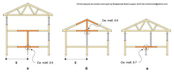 Для внутренних стен несущих нагрузку с кровли или с двух междуэтажных перекрытий, как правило, выбор сечения перемычек производится по таблице 9.6. Максимальная ширина дома указанная в таблице в таком случае будет соответствовать расстоянию между наружной и внутренней несущими стенами (рис. 9.26 а, 9.26 б). Минимальная толщина стоек-опор будет такая же как в таблице.