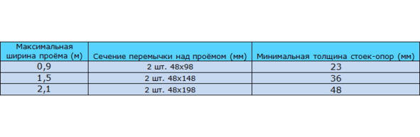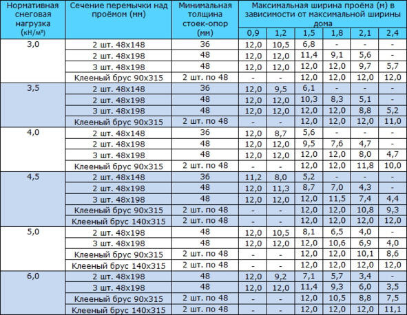 Сечение перемычек определяется исходя из расчётной снеговой нагрузки, максимальной ширины дома (м) приведённой в таблице 9.6, и ширины оконных / дверных проёмов, не превышающих 2,4 м.