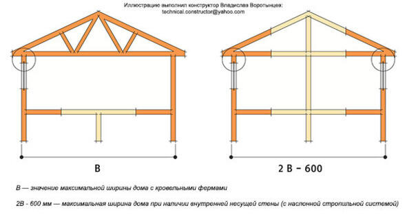 Таблица 9.6 предусматривает использование стропильной системы состоящей из свободно опёртых ферм, т.е. рассчитана на то, что вся нагрузка с кровли будет приходиться на наружные несущие стены (рис. 9.25). Если в вашем проекте предусмотрена внутренняя несущая стена, то в таком случае нагрузка на наружные несущие стены уменьшится примерно в два раза. В таком случае чтобы определить максимальную ширину дома берут значение максимальной ширины и умножают на 2, отнимая при этом 600 мм (см. пример выбора сечения перемычек).