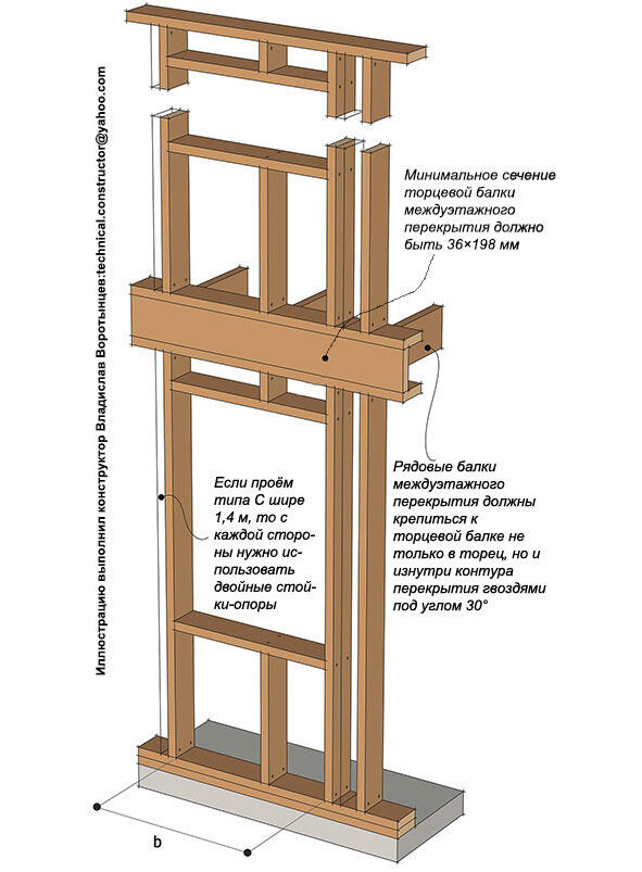 В проёме типа С нагрузка с междуэтажного перекрытия также будет распределяться на опоры, т.к. торцевая балка междуэтажного перекрытия в этом случае выступит в качестве перемычки. При этом минимальное сечение торцевой балки междуэтажного перекрытия должно быть 36×198 мм, а сами рядовые балки междуэтажного перекрытия должны крепиться к торцевой балке в торец и изнутри контура перекрытия гвоздями под углом 30°. Если проём типа C шире 1,4 м, то с каждой стороны нужно использовать двойные стойки-опоры.