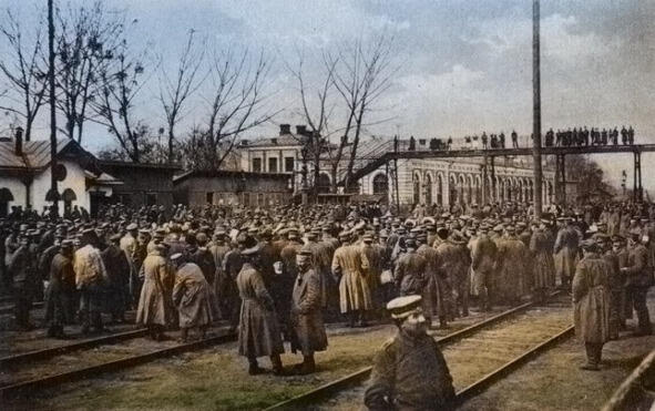 Мітынг каля Любава-Роменскага вакзала ў Гомелі ў 1918 годзе. Фото из источника: http://nashkraj.info/gomelshhina-v-velikoj-vojne/