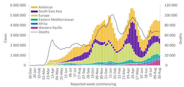 С 30 августа по 5 сентября 2021 г. было зарегистрировано более 4,4 миллиона новых случаев заболевания, глобальная заболеваемость COVID-19 за август оставалась стабильной.