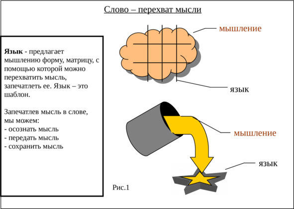 Но язык как будто специально приспособлен для того, чтобы схватить мысль в нужный момент, остановить в застывшей форме ее безумный полет. И происходит чудо в этой застывшей форме мысль становится понятной не только самому «хозяину мысли», но и его собеседникам.