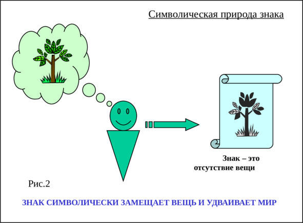 Но человек единственное существо, способное оперировать предметами в их отсутствие. Для этого человек оперирует заместителями предметов знаками. Знак это отсутствие реальной вещи и одновременно ее присутствие в символической форме.