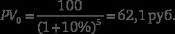 Обратите внимание на следующий момент: для формулы мы используем денежный поток «первого» года, а PV получаем на текущий момент или «нулевой» год. В данном случае «нулевым» годом для нас будет пятый, а «первым» шестой год. Иными словами, полученное значение в 100 руб. это терминальная стоимость на конец пятого года (в деньгах «пятого года»). Чтобы привести ее к общему знаменателю для расчета NPV, нам нужно продисконтировать 100 руб. к началу нулевого года (то есть к деньгам «сегодня»):