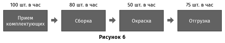 Очевидно, что в данном процессе узким местом является окраска. Общая пропускная способность системы составляет 50 изделий в час. Предположим, что предлагается проект купить дополнительное окрасочное оборудование, чтобы удвоить мощности по окраске. Часто бывает, что считают эффект на весь дополнительный объем производства (плюс 50 изделий в час). Однако из схемы очевидно, что реально объем производства повысится только до 75 шт. в час, так как после этого узким местом системы станет отгрузка. Чтобы повысить объем производства до 100 шт. в час, потребуются существенные дополнительные инвестиции на «расшивку» отгрузки, а затем и сборки. В этом случае экономический эффект проекта увеличения мощностей по окраске можно учитывать только на дополнительные 25 единиц. Такое уменьшение может заметно сказаться на окупаемости проекта. Об этом часто забывают.