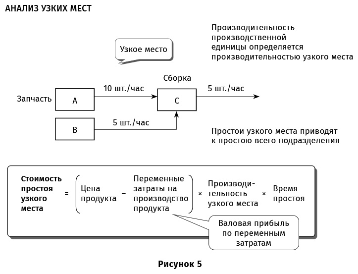 Производительность участка в целом действительно определяется производительностью его узкого места. На рис. 5 общая производительность участка будет составлять 5 единиц в час, даже несмотря на то что станок А может производить 10 единиц продукта в час. В этом случае «расшивка» узкого места помогает увеличить общий выпуск продукции. Если мы увеличим производительность станка В на одну единицу, производство в целом сможет выпускать 6 единиц продукции в час. Как в этом случае посчитать экономический эффект расшивки? Он будет равен прибыли, которую получит компания от производства дополнительной единицы продукции. Чаще всего при увеличении производительности узкого места на небольшой процент производство дополнительных единиц продукции не потребует от вас увеличения издержек, кроме затрат на материалы и переменных затрат на энергоресурсы. Таким образом, экономический эффект расшивки узкого места будет равен маржинальной прибыли от продажи дополнительной продукции.