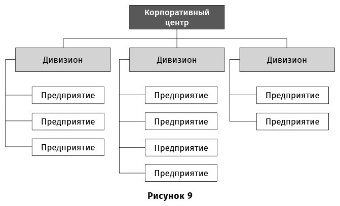 На верхнем уровне компании находится корпоративный центр, роль которого может меняться в зависимости от организации, но в основном это некий единый центр управления общекорпоративными вопросами компании, такими как стратегия, финансирование, отчетность и т. д. Поскольку в крупные компании входят десятки разнородных предприятий, управлять ими всеми из корпоративного центра сложно. В связи с этим крупные компании в качестве следующего уровня управления создают дивизионы. Дивизионы управляют группами предприятий, объединенных по некоему признаку, в основном по продуктовому. Например, крупные вертикально интегрированные горно-металлургические компании обычно имеют три дивизиона: «Уголь», «Руда» и «Сталь». «Уголь» управляет шахтами. «Руда» добычей руды (горно-обогатительными комбинатами). «Сталь» металлургическими заводами и заводами, производящими конечную продукцию из металла (иногда конечные продукты выделяют в отдельный дивизион «Метизы»). Крупные нефтяные компании обычно имеют дивизионы «Разведка и добыча» (собственно добыча нефти, или так называемый upstream) и «Переработка и маркетинг» (нефтеперегонные заводы и заправки, или downstream). На третьем уровне управления крупной компании находятся сами предприятия, которые производят продукцию. Безусловно, существуют различные варианты организационных структур, которые мы не будем рассматривать здесь это тема отдельной книги.