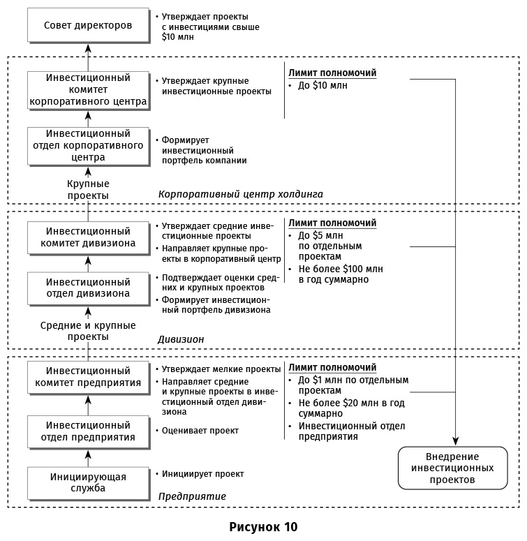 Инвестиционный процесс крупной компании учитывает многоуровневую структуру. Логика при этом проста чем важнее проект (обычно чем выше инвестиции проекта), тем на более высоком уровне управления компании он рассматривается и контролируется. Вот, например, схема рассмотрения инвестиционных проектов крупной промышленной компании (рис. 10).