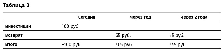 Предположим, что с учетом риска проекта инвесторы готовы вложить в него деньги под 10 % годовых. В этом случае в конце первого года общий долг компании перед инвесторами составит 100 + 100 × 10 % = 110 руб. Из них 80 руб. вернутся инвесторам. В проекте после первого года из инвесторских денег останется 110 80 = 30 руб. В течение второго года инвесторы потребуют на них 30 × 10 % = 3 руб. процентов, то есть общий долг составит 30 + 3 = 33 руб. Из проекта в конце второго года инвесторам вернется 45 руб., то есть они получат на свои деньги не только требуемый процент возврата, но и дополнительный доход в 45 33 = 12 руб. сверх того! На таких условиях деньги в проект вкладывать можно и нужно.