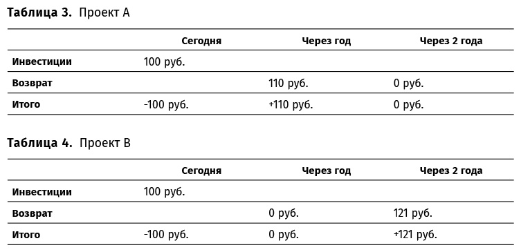 Сделаем следующий шаг. Предположим, у нас есть два одинаковых по риску проекта, в которых требуемый инвестором возврат составляет 10 % годовых (табл. 3, 4).