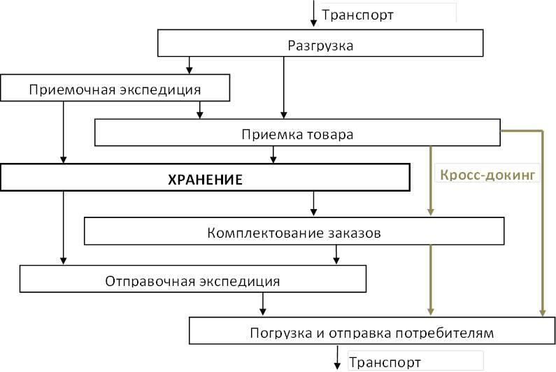 Важно подчеркнуть, что процесс приемки и отгрузки товаров и грузов через склад напрямую, без размещения в зоне хранения называют кросс-докингом, который бывает одноэтапным (груз проходит через склад в качестве неизменного отдельного заказа) и двухэтапный (груз подвергается переоформлению и переформированию).