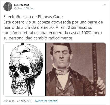 Uno dei casi più riconosciuti nella storia delle neuroscienze è quello di Phineas Gage (Damasio, 2018), che ha subito un infortunio sul lavoro in una miniera dove lavorava. Sfortunatamente una delle sbarre gli ha perforato il cranio, e da quel momento in poi, il suo comportamento è cambiato, diventando irregolare, imprevedibile e persino spericolato (@ Neuro100cias, 2018) (vedi Immagine 6).