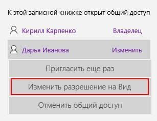 Право на просмотр даёт возможность лишь поменять название и цвет записной книжки только для себя, копировать на неё ссылку и закрепить в меню «Пуск». Имя и цвет записной книжки изменятся только для нас: для владельца и других пользователей название и цвет останутся прежними.