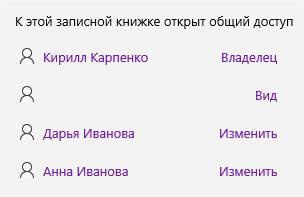 На панели общего доступа записной книжки отображаются все пользователи с указанием прав. «Владелец» имеет все права. Статус «Изменить» указывает на возможность редактирования содержимого записной книжки. Статус «Вид» даёт возможность просмотра заметок. Отсутствие имени или адреса электронной почты у одного из участников указывает, что записная книжка доступна по ссылке.