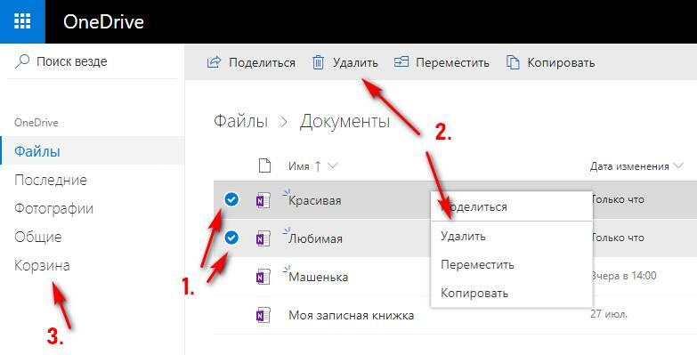 4. В открывшемся контекстном меню либо на панели меню нажмите «Удалить». Записная книжка будет помещена в Корзину OneDrive.