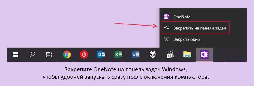 Для удобного запуска OneNote закрепите приложение на панели задач Windows.