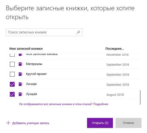 3. В открывшемся списке поставьте галочки напротив записных книжек и нажмите «Открыть». Если записных книжек много, то воспользуйтесь поиском.