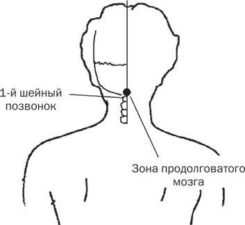 2. Садимся на стул, слегка наклоняясь вперед. Надавливаем и массируем зону продолговатого мозга (рис. 7) до тех пор, пока не остановится кровь.