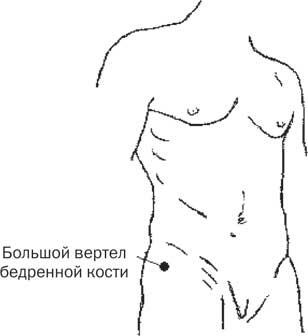 1. На ноге, сведенной судорогой, сильно надавливаем в течение 7 секунд на большой вертел бедренной кости большим пальцем (рис. 9).