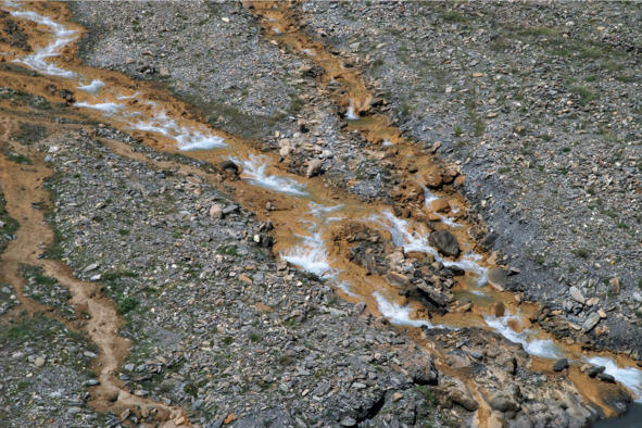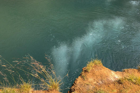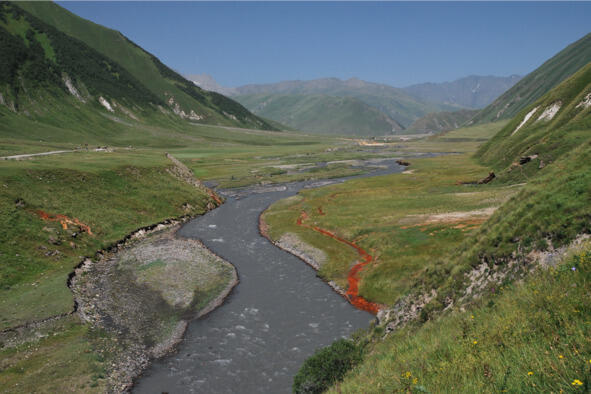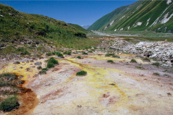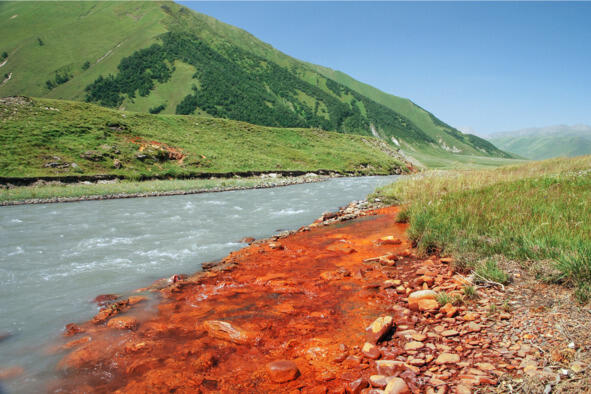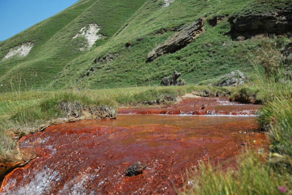 Вода кристально чистая, питьевая и с привкусом железа, но из-за толщи воды разглядеть кратер озера можно не больше чем на метр-два. Длинные нити белесых бурунов, разрезающих лазурную гладь, превосходно смотрятся со склона горы. Как и вид на округу с «кровавыми», стелящимися по земле, рукавами, вырвавшимися из подземных источников. Неповторимая игра цвета: темно-синее озеро с огненно-рыжим руслом, устремленным к темно-серым водам Терека. Зеленый ковер с россыпью горных цветов и желто-белые с ржавыми прожилками террасы миниатюрной копии турецкого Памуккале.