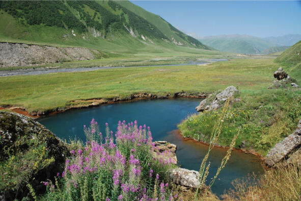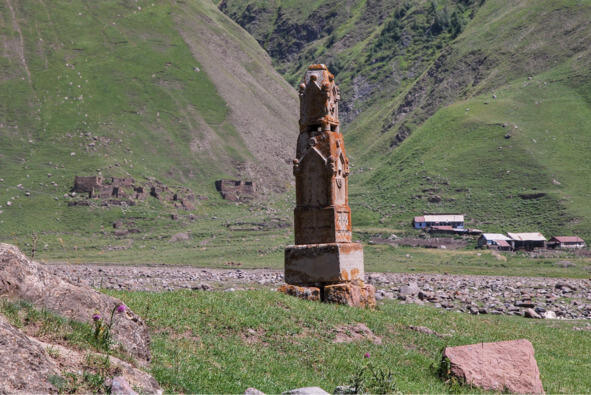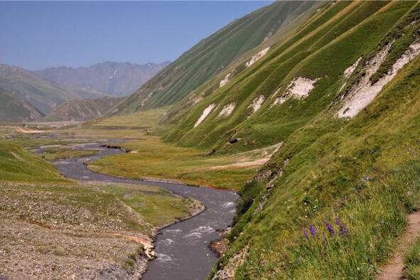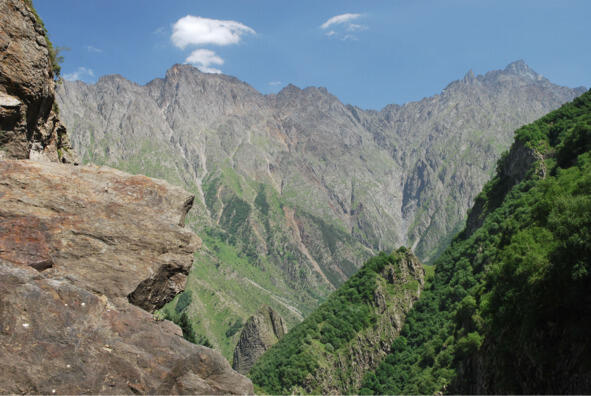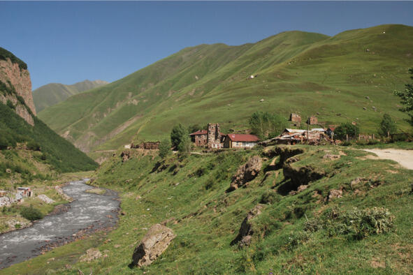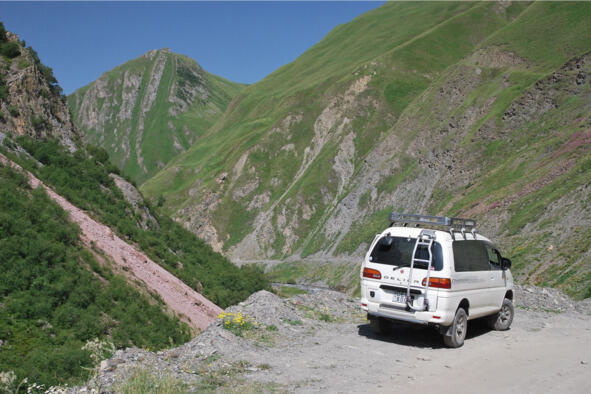 С самого утра нас ждет прогулка в ущельеДжута (Juta). Идти километров семь, практически по равнинной местности с превышением в тысячу метров. Но это все мелочи по сравнению с тем, что попасть на плоскогорье можно лишь одним способом. От одноименного села, куда нас забрасывает Алекси на своем минивэне Delica Mitsubishi, нужно подняться по горной тропе, уходящей круто вверх под восемьдесят градусов. До ровного участка взбираться метров пятьсот, но после выпитого накануне они превращаются в вечность. Голова гудит, отзываясь тупой болью при каждом шаге, вот-вот взорвется. Хороший урок. Здоровье все же дороже мнимого удовольствия. Одна отрада уже там, на возвышенности, есть небольшое кафе с видом на ущелье и горную гряду. Нужно только взять чашечку кофе, выйти на свежий воздух, подыскать себе пуфик, гамак или удобный камешек, усесться и, вдыхая ароматы наступающего дня, насладиться терпким напитком. И лишь после этого совершить неспешный марш-бросок к подножию седловидного перевалаЧаухи (Chaukhi).
