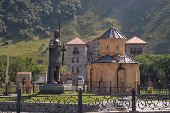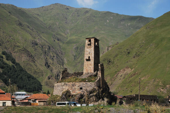 Совершенно случайно замечаю, что заднее колесо у нашего вездехода пробито. Резина замята, на ободе, вероятно, уже несколько километров едем. А при такой тряске на проселочной дороге не сразу и поймешь: камни по днищу стучат или диск по ухабам скачет. Вот вам и пословица в руку: «За двумя зайцами погонишься ни одного не поймаешь». После такого уже не до осмотра окрестностей. Хотя в Сно есть на что посмотреть: развалины старой крепости с отлично сохранившейся башней, красивая церковь, хотя и современная, да огромные валуны с ликами известных грузин. Но все это захватываем постфактум. В отель нас отвозит сын Алекси, а сам он отправляется в мастерскую, откуда забирает машину, по его же словам, лишь поздней ночью.