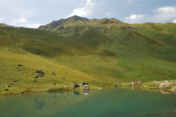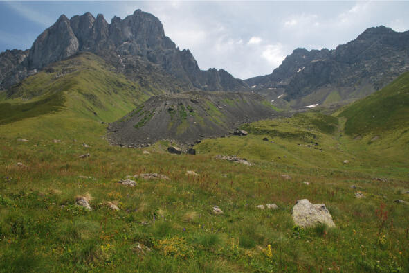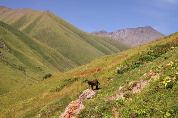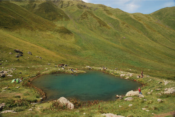 Тропа хорошая, утоптанная, вдоль речушки стелется, местами ее пересекает, оттого часто разветвляется: можно вброд идти, можно зигзаги воды повторять. Все едино, конечная точка одна: синее блюдце небольшого озерца, откуда до перевала рукой подать. А за ним Абуделаурские цветные озера и деревушка Рошка (Roshka), куда нам предстоит отправиться на следующий день. А пока берем левее и через пару километров упираемся в нагромождение огромных камней, под которыми, шипя и извиваясь, клокочет стремнина. Ни деревянного настила, ни выбоин на камнях для зацепки. Лишь сноровка да смекалка. Не скажу, что особо сложно, но приятного мало.