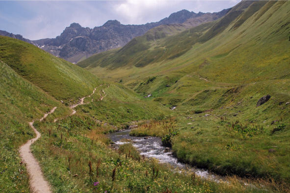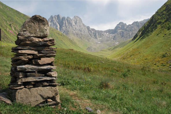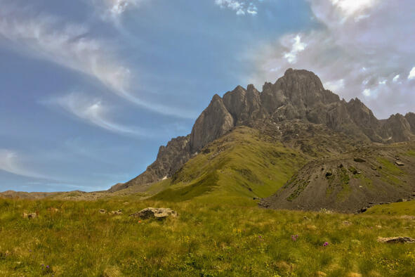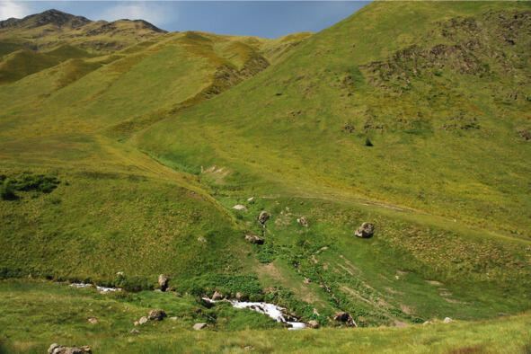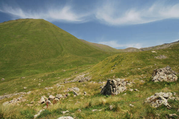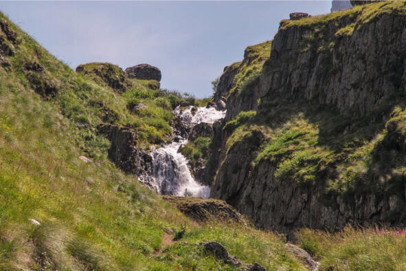 Обратно возвращаемся той же тропой, только речушку переходим в другом месте, чуть ниже, где валун в воде лежит. Как раз посреди русла. Хоть какое-то подспорье, только прыгать все равно нужно. Как ни крути, но риск все же есть. Так что, возможно, правая тропа безопаснее будет. А так виды в ущелье потрясающие, особенно на фоне василькового неба с небольшими белыми облаками-завитушками. Да и с погодой нам повезло. Ни жарко, ни холодно, ни дождя обещанного.