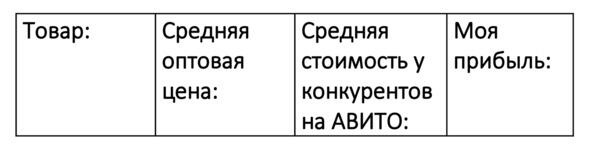 Прибыль: разница между средней стоимостью на АВИТО и средней оптовой ценой. Получилась цифра меньше 10001500 рублей? Вычеркивай товар из своей таблицы его продажей не выгодно заниматься.