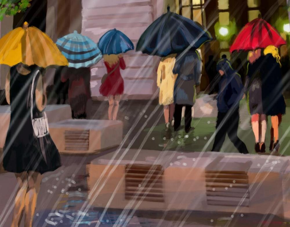 Стоило нам выйти из объятий родного метро, как сразу хлынул дождь, правда тёпленький. «Нормальный, летний дождь». Впрочем, нам не грозило промокнуть. У моего неожиданного кавалера был, наверное, самый гигантский зонт на свете. И на нём, конечно же, был логотип Москвы. Казалась ещё чуть-чуть, и он начнёт с ним танцевать, как в старом фильме «Поющие под дождём», и провозглашать свою любовь мне, прохожим, городу своего детства. Но этого не случилось, а жаль, вот, ей богу, станцевала бы с ним!