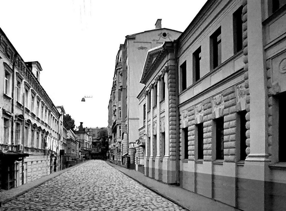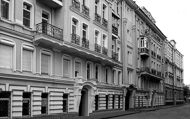 Справа дом Готье-Дюфайе ( 3). За ним доходный дом Грибовых ( 1-а). Слева дом Крумбюгеля ( 6), а вдали у перекрёстка особняк Назара Грибова