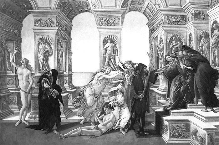 Сандро Боттичелли «Клевета» (1495 г.). Галерея Уффици, Флоренция, Италия.