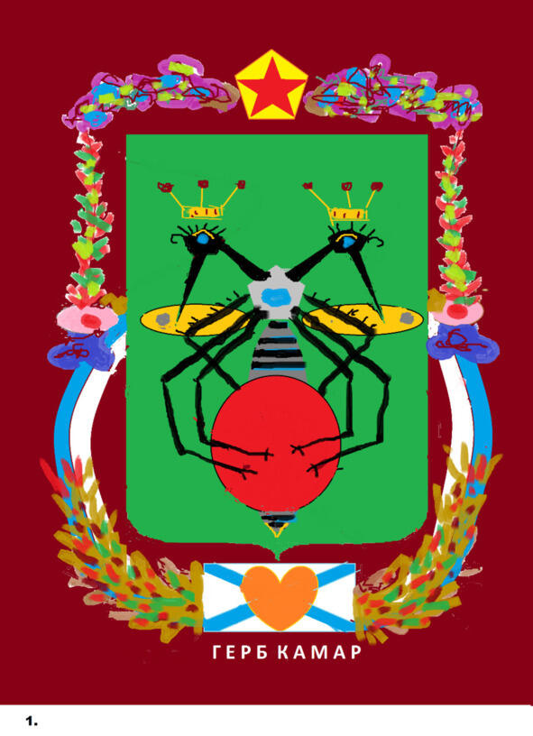 ГЕРБ ПОСЕЛЕНИЯ «К» (комп. графика). Поселение жило независимо от начальства. Властям было просто не добраться до него. Чтобы обозначить свою независимость, граждане этого поселения решили сочинить свой герб. Они в качестве главной гербовой фигуры выбрали самое кровожадное местное существо, а именно, комара, причем комара двухголового, как отражение специфики местной фауны.