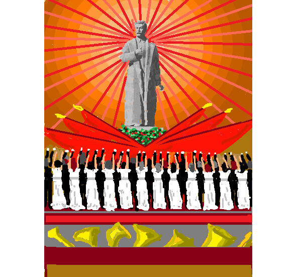 «СЛАВА ВЕЛИКОМУ СТАЛИНУ " (комп. графика). Отгремели фанфары в честь Сталина, сжались кукурузные плантации, закончилась война в Афганистане, а жизнь в стране не изменялась. Её пронизывал жёсткий стержень по имени ДЕФИЦИТ. Он был на всё: от туалетной бумаги до автомобилей. Одно врем даже с водкой была проблема. Винные магазины осаждали толпы страждущих. Дело порой доходило до поножовщины.