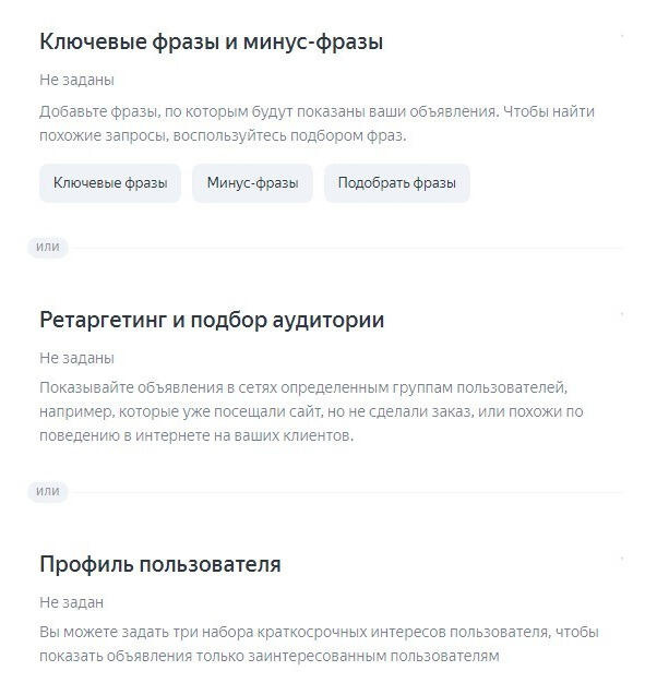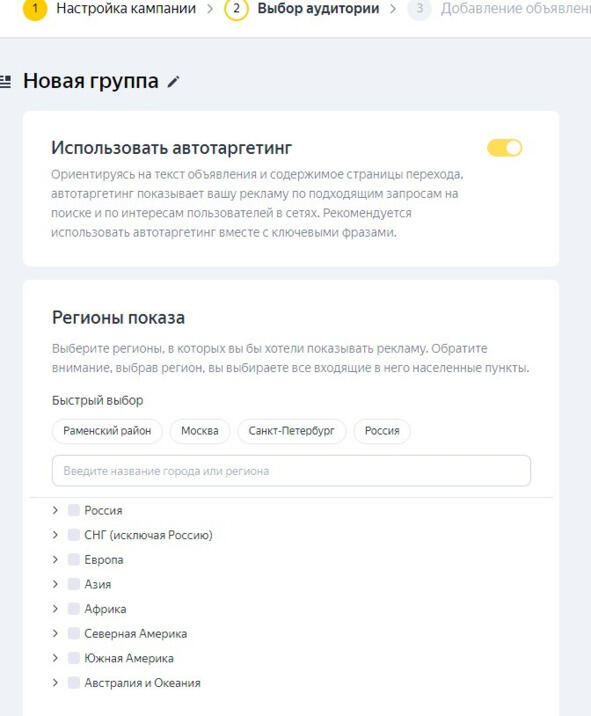1. Использовать автотаргетинг, ставим да (желтый цвет)
