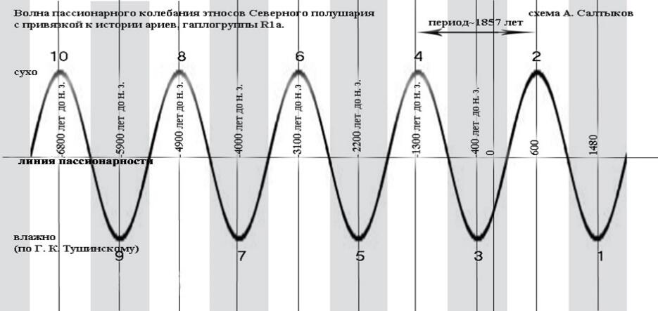 На схеме ниже показана Волна пассионарного колебания этносов Северного полушария, а ниже схема периодов солнечной активности «Цикл Холлстата». Впервые свойства волны колебания этносов я опубликовал в своей книге «Код белых берёз». Там была опубликована только часть волны периодом одного колебания равного 1857 лет. Что из себя представляет «Волна»? В книге я писал: «Это внутреннее давление существует всегда и не идентично пассионарным толчкам, описанным Л. Н. Гумилёвым.