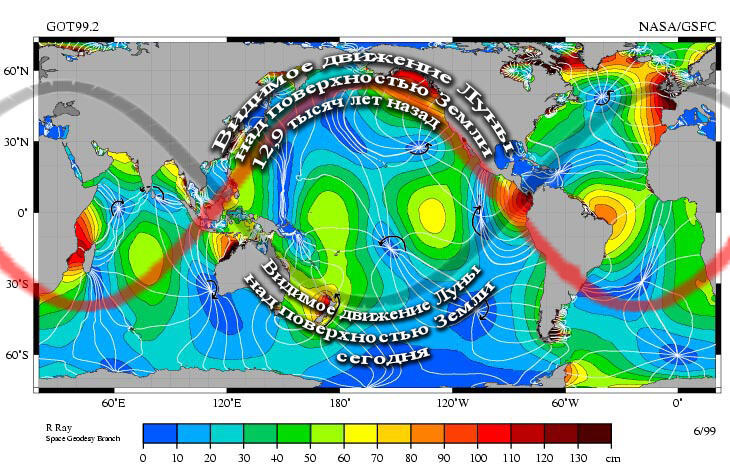 Это колебания каждодневны, и происходят в движении в одних и тех же местах. Но, если взять длинные временные рамки, скажем в 13 тысяч лет, то мы обнаружим глобальные сдвиги. И где-то откуда ни возьмись за какую-то пару сотен лет возникнет пустыня, где-то ледник, а где-то наводнение. Взаимодействие Луны и Земли сложны. Но не менее сложно и поведение самой земли. Если мы посмотрим на карту выше внимательнее, то увидим, что движение Луны над поверхностью Земли по отношению к экватору происходит под углом. Дело в том, что Луна движется по орбите почти параллельно плоскости орбиты Земли, а не экватору. Наклон Земли к перпендикуляру равен 23,5 градусов. Плоскость орбиты Луны 28,7 градусов к экватору Земли.