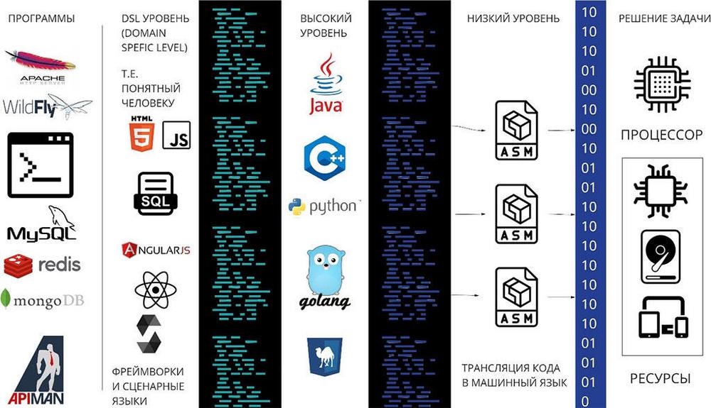 Для этого появился специальный инструмент и язык Assembler, который переводил программу в машинный язык. Он кодирует все сигналы в 0 и 1, чтобы ваша машина могла понять, чего вы от нее хотите. Раньше все программы писались на assemblere. У каждого процессора свой диалект assemblera, как у жителей разных стран. Программа написанная на assemblere для одного процессора совершенно не совместима с другим процессором, потому что у него как вы понимаете другое количество транзисторов. Поэтому она не будет просто работать или запускаться. Это, кстати, и означает совместимость программ, когда ваши итишники говорят, вам что эта версия несовместима с версией вашего оборудования и нужно потратить тонну денег на миграцию, то это означает, что программа на ваших процессорах просто не запуститься и нужно ее фактически переписать. Все это было круто, но оказалось, что писать на ассемблере очень сложно, хотя и эффективно. Вы можете напрямую управлять памятью вашего устройства, порядком обработки команд и т.д.