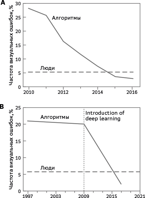 Рис. 1.3. Повышение точности работы машинного искусственного интеллекта с изображениями (А) и речью (В). При работе с упорядоченными базами данных и выполнении узконаправленных задач качество работы искусственного интеллекта выше качества работы человека. Источники: график А с изменениями из: V. Sze et al., Efficient Processing of Deep Neural Networks: A Tutorial and Survey, Proceedings of the IEEE (2017); 105 (12), 22952329. График B с изменениями из: Performance Trends in AI, Word Press Blog (2018): http://srconstantin.wordpress.com/2017/01/28/ performance-trends-in-ai.