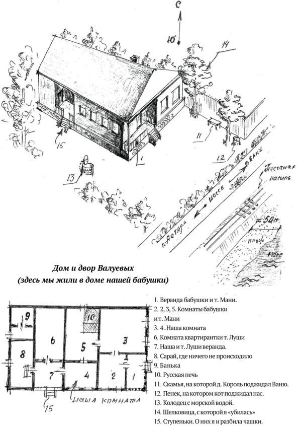 Сегодня к нам придут дядя Илюша и тетя Люба. Они хотят посмотреть, как мы устроились. Мы довольны своей комнатой (на плане дома она 4). Комната самая маленькая из 5 комнат этого дома, 2 окна, 2 подоконника, т.е. у Светы и у меня свое место для школьных занятий. Но для приема гостей тесновато. Да еще дядя Илюша большой, как медведь. Когда они пришли к нам и мама их усадила, как могла, места для нас, детей, не осталось. Мы, будто стража, стояли у дверей. Намечался чай с угощениями (дядя Илюша и тётя Люба что-то принесли к чаю), но чашек, или на худой конец стаканов, у нас нет.