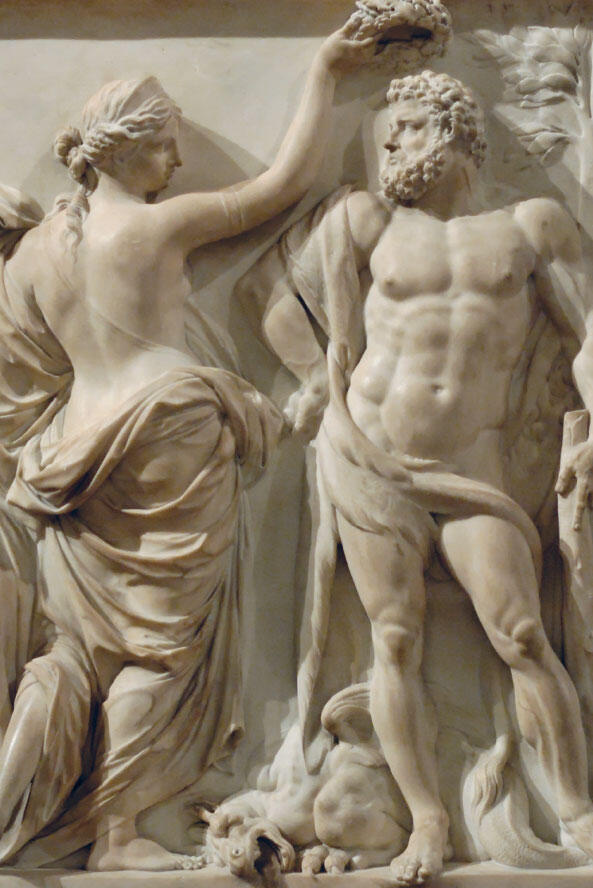 Скульптура могучего бога Геракла. По преданию, Геракл был незаконным сыном Зевса от Алкмены, самой мудрой и красивой из всех смертных женщин. Гера разгневалась на Зевса за его измену; еще больше она разозлилась, узнав, что муж приложил младенца-Геракла к ее груди, когда она спала, и позволил ему высосать немного молока, отчего Геракл стал отчасти бессмертным, превзойдя всех смертных мужчин в силе, росте и способностях.