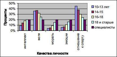 Что касается начинающих юных спортсменов, из 123 свойств и черт характера они оценили как важные только 52: 100 % «Порядочность», «Уважение к старшим», «Исполнительность», «Трудолюбие», «Внимательность», «Жизнерадостность», «Уважение к товарищам», «Уважение к тренеру», «Выносливость», «Умение преодолевать трудности», «Решительность», «Память», «Ответственность»; 99,9 % «Добросовестность», «Ответственность», «Терпеливость», «Ум»; 99,8 % «Требование к себе», «Обучаемость»; 99,7 % «Доброжелательность»; 99 % «Самостоятельность», «Темпераментность», «Наличие собственной позиции»; 98,7 % «Самообладание»; 98,1 % «Любознательность»; 98 % «Благодарность», «Учет ошибок», «Эмоциональность»; 97,5 % «Ответственность»; 97,1 % «Отношение к неудаче»; 97 % «Патриотизм», «Отношение к успеху», «Настойчивость», «Пунктуальность», «Быстрая адаптация»; 96,5 % «Чувство долга»; 96,4 % «Заботливость»; 96,3 % «Находчивость»; 96 % «Целенаправленность», «Умение работать», «Толерантность», «Стремление к победе», «Аккуратность», «Соревновательный дух», «Любознательность»; 95,8 % «Надежность», «Умение анализировать»; 95,6 % «Спортивная злость», «Готовность к действию»; 95,4 % Добросовестность», «Азартность»; 95,1 % «Внимательность».