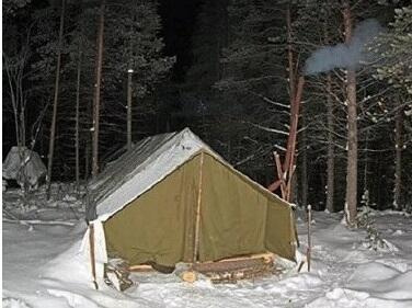 Я жил в палатке, где в задней ее половине по всей ширине были построены единые нары-настил из жердей. В передней части сбоку стояла печка с выводом труб дымохода вверх.