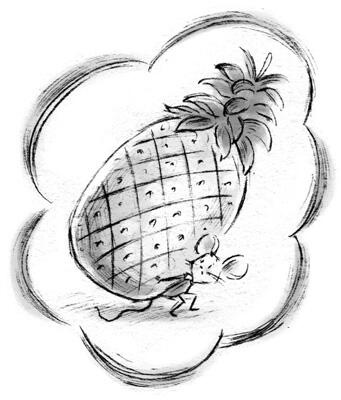 «В той книге говорилось, что муравей может переносить груз в пять раз тяжелее его самого! Наверное, это то же самое, как если бы мышка несла на себе целый ананас! Не думаю, что я смогла бы поднять такую тяжесть. И даже не уверена, что мне бы очень захотелось. Видела я как-то этот самый ананас в большом магазине. Он такой колючий на вид» думала мышка.